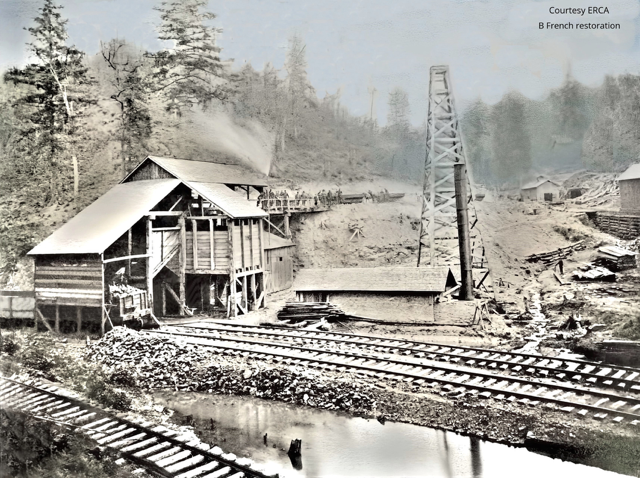 | This is the Buckeye Tipple as first constructed in the mouth of the hollow (Buckeye Hollow) off Simmons Creek just north of Freeman, West Virginia. No one knows how the name Buckeye came about. Perhaps the hollow off Simmons Creek , where the tipple and mine were located, held that derviation prior to the mining activities. When Buckeye opened in 1886 it was the fifth coal mining operation in the area. The Buckeye Mine operation was the first to have coke ovens in West Virginia. The remains of some of these ovens are visible from Rt.52 near Buckeye Hollow. The "Number Three" coal seam at the Buckeye operation was about six feet high with the coal termed "clean and marketable". About two hundred miners and laborers were employed at the Buckeye Mine, producing some 100,000 tons of coal and 20,000 tons of coke annually. At the turn of the century the operation included two tipples, tenant houses, offices and the modern equipment that made the Buckeye Coal and Coke Company a very profitable coal mining operation. |