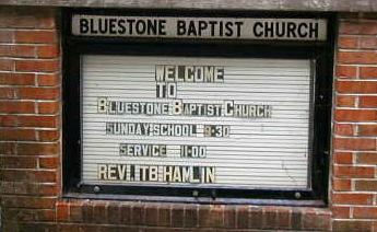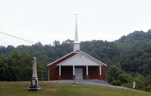 | Bramwell's Riverside Baptist Church (formerly known as the Bluestone Baptist Church) in Freeman, WV. was founded in 1883. The services were initially held in the old Mission Chapel near the entrance to the road leading up Jones' hill. In 1906 the church was relocated to the previously owned Methodist Church Building beside the Freeman Cemetery. This church building has gone through several renovations over the years. The church is now know as the Riverside Baptist Church. The building has been completely renovated and is now a brick structure. The Freeman Cemetery is now called the Oak Hill Cemetery and remains beside the Riverside Baptist Church. The tombstone of John Freeman is shown in the photograph foreground. |
