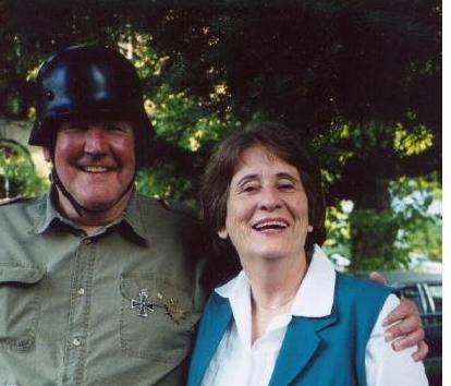 Doug Murphy, Bramwell High School Class '51, refreshes Betty Cole's memory of the "good old" military days.....Doug's German helmet has added greatly to the festivities at several reunions.