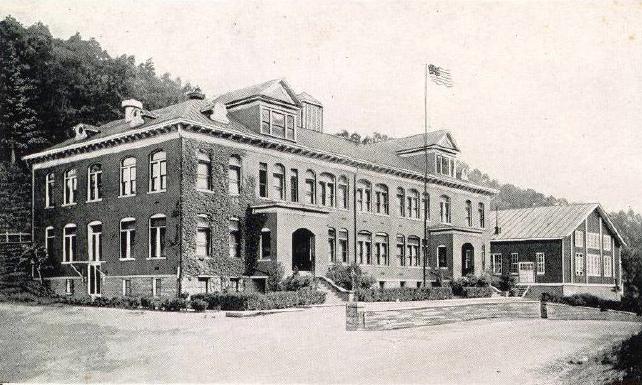 This photograph of the original Bramwell High School was taken from an old Post Card. This building was built at the turn of the century and was destroyed by fire in 1933. The Bramwell Public Grade School was established in 1894. Professor E. S. Baker of Greenbrier County was the first principal of the school. He came to Bramwell in 1894, the first year or the school. He remained principal until 1900.