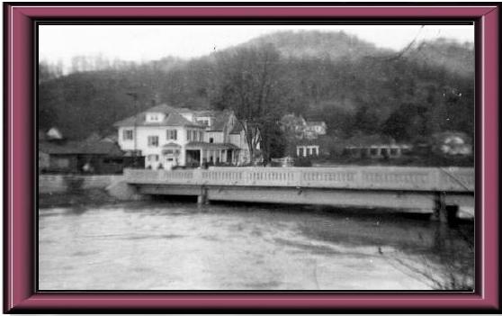 This photograph highlights the flood waters of Bramwell's 1955 flood. Many of the Historic Houses on Main Street received water damage from the flood. The view is from the road to Coopers looking Southwest. |