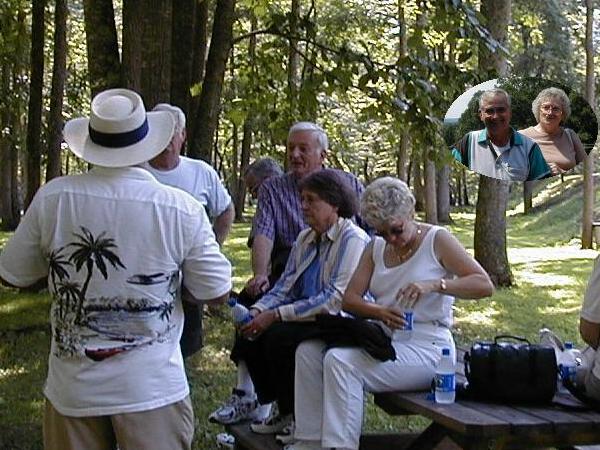 This photograph was taken ( June 2000 ) at the WV Pipestem State Park after these folks attended the Bramwell High School Class '51 Reunion Breakfast at the Bluefield Holiday Inn. ( L - R ): John Vaughan, Jim "Soy Bean" Shelton, Pete Vance, Ward Cole, Betty Cole, Vicki Vaughan and Reva Petty. The inserted photo of Pete Vance and Flo Woods was also made on this day trip. ( Photograph by Bill Petty ... Sorry John , Pete and Jim about the angle of the photo.) |