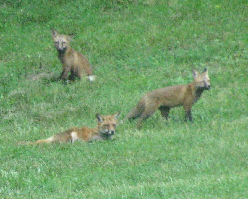 Three coyoties from a family of six young coyotes playing in back yard. Mother is no where to be seen.Moth