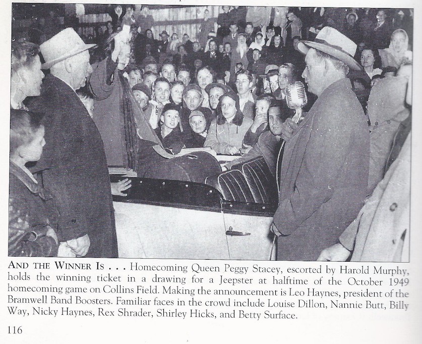 This above picture is from the 1949 Bramwell High School Homecoming parade on Main Street in Historic Bramwell,West Virginia . Peggy Stacey was the Homecoming Queen that year and is shown in the center of the venicle. The vehicle was a "Jeepster" built by the Willys Company and was a sport version of the World War II Jeep. This vehicle was auctioned off to raise money for the school. It was won by the Harris family who ran the grocery store at Shinbriar,WV. Bramwell High School beat Graham High School ( 44 to 7 ) at the homecoming football game. That was considered a major upset in football for the entire state of WV. It was one of the worst football loses that Graham High School had ever received . The below picture is the drawing of the winning number for the new Jeepster. (Photograph furnished by Dizzy Harris.)
