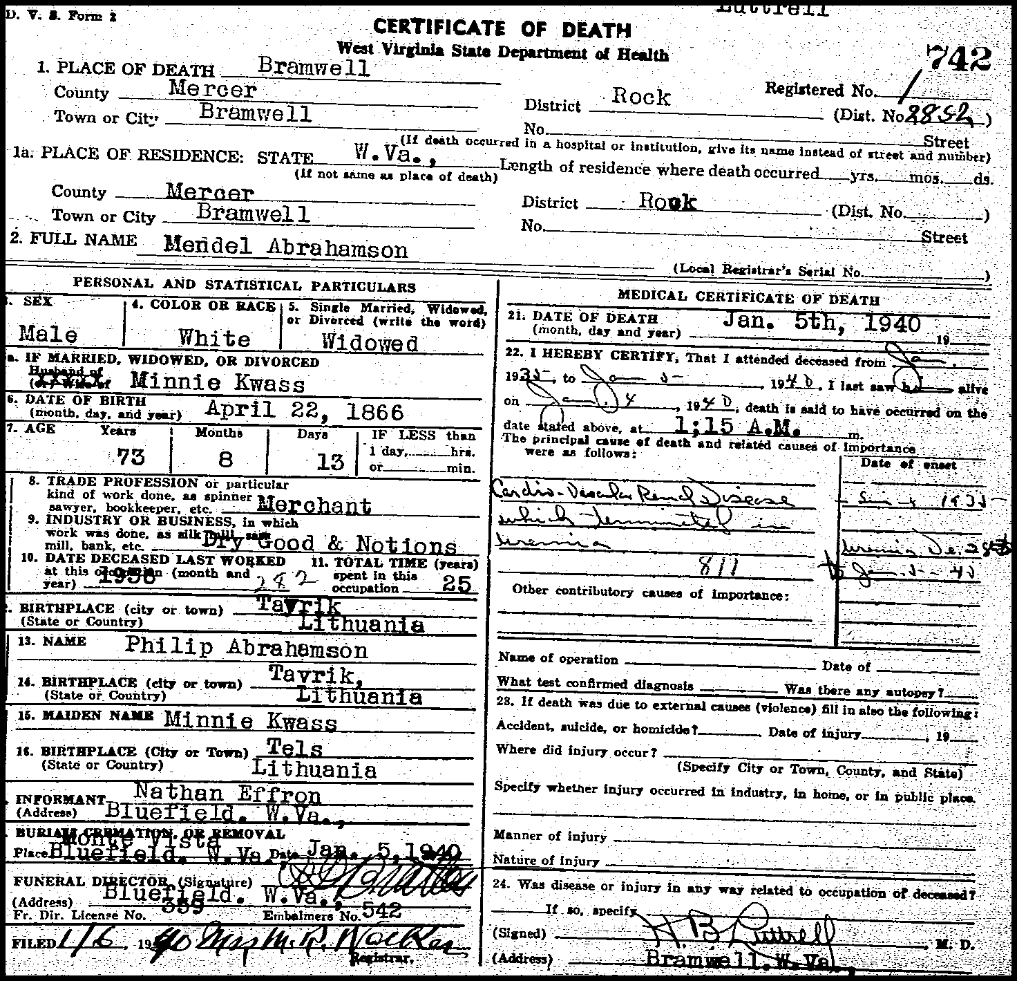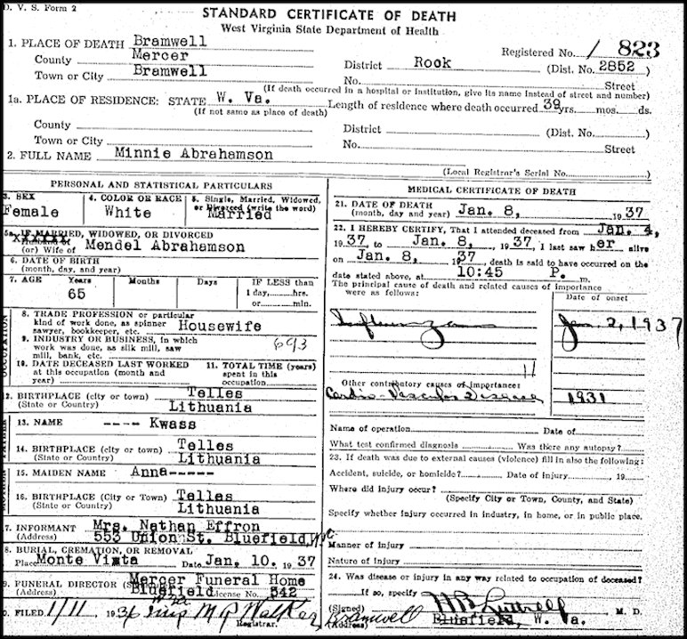 Mendel B. Abrahamson (1866-1940) was a pioneer businessman that operated a "dry goods and notions" store in Bramwell, WV in the late 1800s and early 1900s. He was born in the town of Tavrik, Lithuania. His wife, Minnie Kwass Abrahamson (1873-1937) was also born in Tels, Lithuania. They had one duaghter, Anna Abrahamson Effron (1903 -1988). Bramwells's Victorian Elegance Apartments was where Mendel Abrahamson and his family lived while they operated the Abrahamson store on Main Street. These apartments were located beside the Historic Pence Hotel building and Bramwell Theater in the open balcony building. Mrs. Jenny Pence had this brick building built after the January 1910 Bramwell fire that destroyed her first hotel and many of the wooden frame buildings along Main Street. She lost control of the hotel during the Depression and the building was converted to apartments. The Main Street view page linked below shows a view of the buildings along Main Street as they exist today. All three family members are buried in the Monte Vista Park Cemetery, Bluefield, WV. Mendel Abrahamson's Spouse & Children: Children: