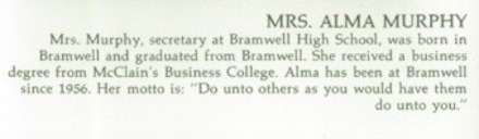 On November 21, 2018, Alma Yon Murphy passed away while she was being cared for at Bluefield Regional Medical Center. She was 89 years old. Born May 4, 1929 in Bramwell, WV, to an Italian emigrant family who came into the United States at Ellis Island, NY, Alma lived her entire life in Bramwell. She was a lifetime member of the Bramwell Presbyterian Church where she also sang in the choir. She was a wonderful mother and dedicated secretary at Bramwell Schools where she was employed from 1954 until she retired. While at BHS, she touched the lives of many students in so many ways and to her, these were “her kids”. She loved to reminisce and tell stories of her kids and times at BHS. She loved her hometown and was a “Mighty Millionaire” at heart. She will truly be missed by many. Left to cherish many memories is her only child, Greg (wife Debra) and granddaughter Katie. She was preceded in death by her husband, Charles H. Murphy; her mother and father, Cristina and Levio Yon; a sister and brother, Eva Yon Hill (Clifton) and Italo Harry Yon (Wanda). She is also survived by her niece Cristina Hill and nephews Steve Hill (Barbara), Jerry Yon (Pamela), Don Yon, and Charles Yon (Libby). Visitation will be at Cravens-Shires Funeral Home on Saturday, December 1, 2018, 2:00 PM to 4:00 PM and the funeral service will be Sunday, December 2, 2018, 1:00 PM, at Cravens-Shires with Minister Frank Watkins officiating and graveside services following at Woodlawn Memorial Park, Bluewell, WV. In lieu of flowers, donations to Bramwell Presbyterian Church or the local humane shelter would be appreciated. Online condolences will be accepted at www.cravens-shires.com. Cravens-Shires Funeral Home in Bluewell is serving the family.