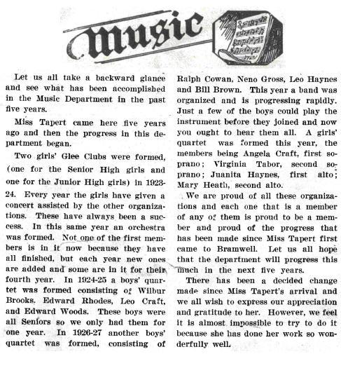 From the Bramwell High School Pinnacle yearbook of 1928 comes these two photographs of Bramwell Orchestra and Band. Miss Tapert directed both the Band and Orchestra. (Photograph and yearbook material furnished by Mr. Edmund Woody ) |