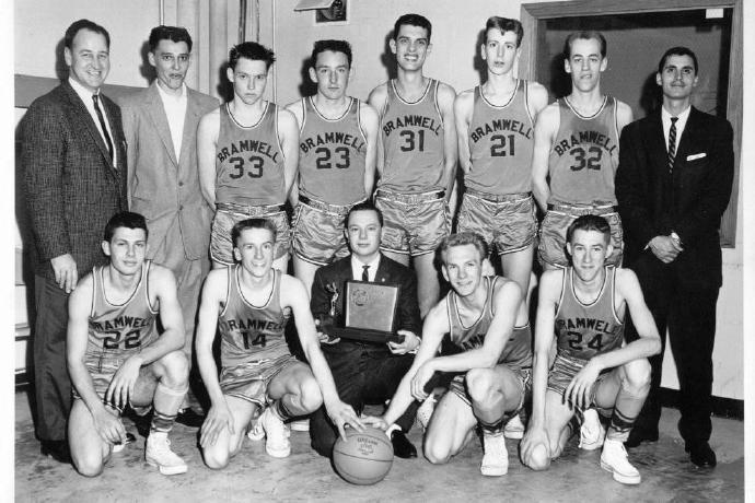 1961-62 Bramwell High School Basketball Team Bramwell won the West Virginia Class A, Section 23 of Region VI championship for the second year in a row. Top Row ( L- R ): Coach Webb, Brady Smith, Jerry Tolbert, Ronnie Duncan, Dick Corner, David Roberts, Jerry Lester and Coach Lambert. Bottom Row ( L - R ): Johnny McCarty, Shane Jones, Larry Grainger, Buddy Sparks and Tommy Wills. ( Photograph furnished by Louise "Weesie" McNulty Gibson. BHS Class '63 ) |