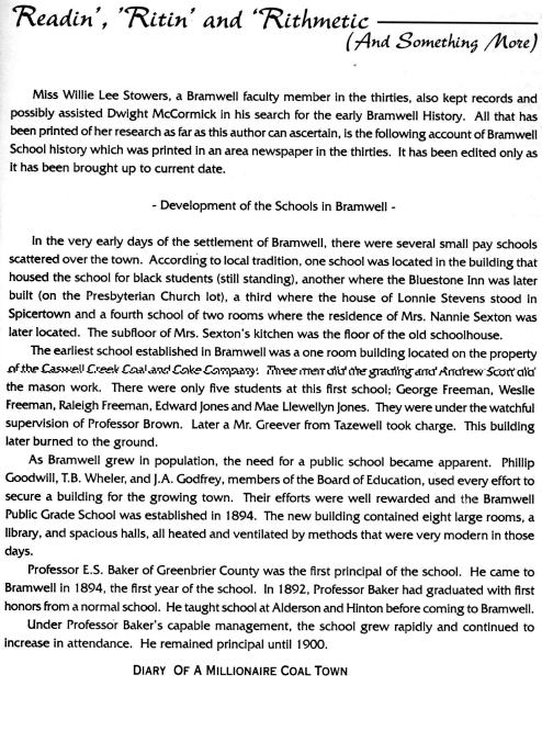 The text of the Bramwell High School History Lesson is from Martha Jane Becker's Book: " Bramwell ..... The Diary of a Millianaire Coal Town "