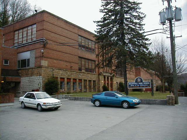 | This view of Bramwell School was taken on 26 March 1999. The school now has students only through the sixth grade. In recent years the Old Grade School and High School Buildings have been connected together by a third smaller building. The old "Home Economics" Cottage and Band Building have been removed. In their place a new gym was built (look to the right) with construction starting in the 1962. However, the High School and Grade School Buildings remain as constructed in 1934 with the old gym having been converted to a cafeteria in the early 1960s. Older alumni will notice that Ms. Maude Smith's classroom (from the 40s and 50s) has apparently been converted for some special use. The concrete blocks in the window are certainly a change from the original construction. |