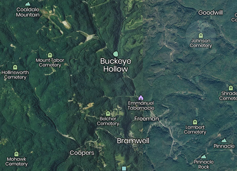 This is a present day satelite map of the Buckeye Hollow where the Buckeye Tipple, Mines and Houses were located.