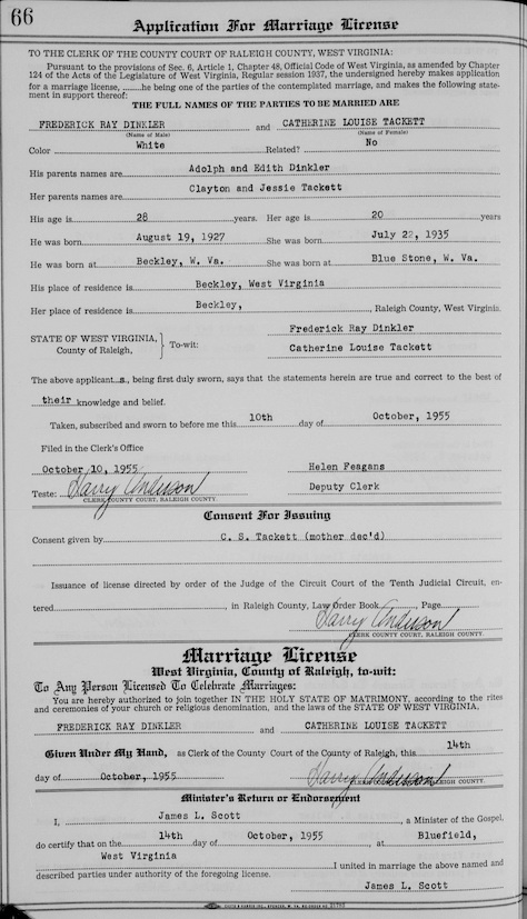 Catherine was the daughter of Clayton Samuel and Jessie Pearl Chambers Tackett. Her husband was Fred Dinker; Sons, Richard Dinkler and wife Lanona of Ontario, CA, Stanley Dinkler of Virginia Beach, VA, Fred Dinkler, Jr. and wife Cheryl of Mount Hope, WV and Anderson Dinkler and wife Billie of Mount Hope, WV; daughter, Connie Dinkler of Salisbury, NC. Those left to cherish Catherine's memory include her husband, Frederick "Fred" Ray Dinkler ; sons, Richard Dinkler and wife Lanona of Ontario, CA, Stanley Dinkler of Virginia Beach, VA, Fred Dinkler Jr. and wife Cheryl of Mount Hope, and Anderson Dinkler and wife Billie of Mount Hope; daughter, Connie Dinkler of Salisbury, NC; a loving twin, Freda Mae Mallory of South Charleston, WV; grandchildren, Steven Dinkler of Daniels, Jason Dinkler and wife Amanda of Pax, Annette Dinkler of Colton, CA, Ryan Dinkler of Salisbury, NC, Avalon Bingamon of Statesville, NC, Lana Calloway and husband Sam of Oak Hill, Leigh Ann Anderson of Oak Hill, Autumn Truman and husband Jim of Oak Hill, James Lanham of Pax, Harley Reed and Jared Kessler both of Mount Hope; 10 great-grandchildren and numerous nieces and nephews and also his loving caretaker, Cindy Green of Fairdale. Frederick "Fred" Ray Dinkler Sr., age 86, of Mount Hope,WV was called home on Tuesday, July 15, 2014