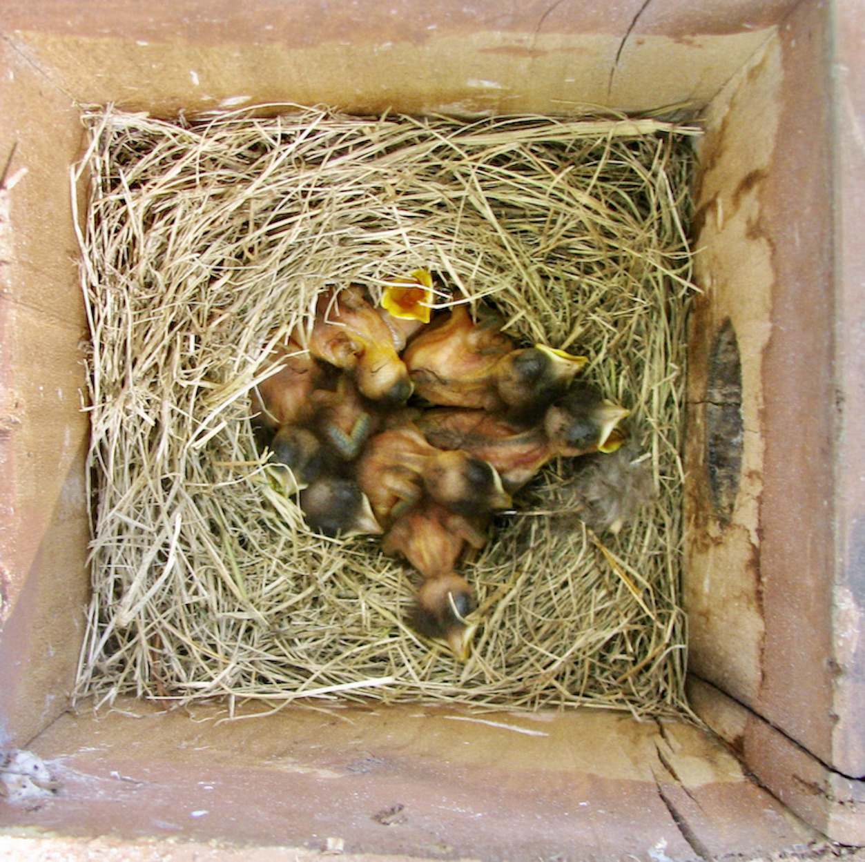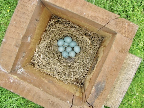 The Eastern Bluebirds are abundant on Autumn Haze Farm, Amissville. Bluebird nest holding nine eggs at Autumn Haze Farm in year 2020. This extremely rare 9 egg event may be elgible for the Guinness World Records. There are 25 bluebird houses located in the fields at Autumn Haze Farm. Over 100 bluebirds are presently raised here yearly. We have been raising these beautiful birds here on the farm for over 50 years. |
