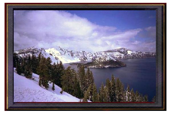 You are looking at the beautiful and famousCrater Lake in Oregon. This lake was created by a volcanic erruption that occurred approximately 65,000 years ago. Summer boating tours are given on the lake by the National Park Service with a stop made at "Wizard Island" , which is also featured in the picture. The rim of this island holds a burried treasure on what is known to some as Lyle's Rock. The treasure is be retrieved the next time we return to Crater Lake. This site is a wonderful senic place to visit during your summer vacation. The Crater Lake Lodge, located on the rim of the crater, is also a great place to visit and enjoy delicious food.