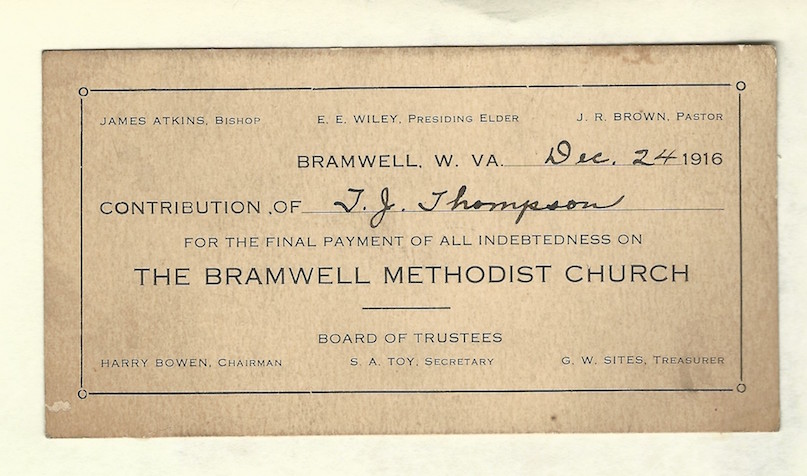 The subject document signifies the contribution of Thomas Jefferson Thompson's contribution to assisting in the final payment of all indebtedness on the Historic Bramwell Methodist Church. Note the names of Bramwell pioneers on the Church's Board of Trustees. Bramwell pioneers. Harry Bowen and S. A. Toy are featured on the Historic Bramwell site. |