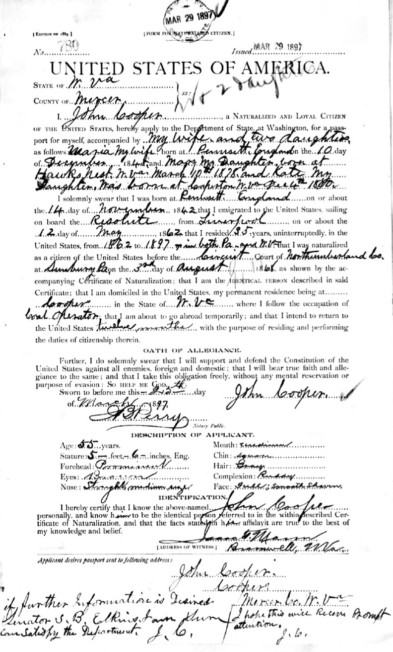 Dec.8, 1899 funeral announcement for John Cooper; John Cooper at his home in Coopers, WV about 1890. ( Photograph furnished by: Dizzy Harris ) Thomas Park Section of Woodlawn Memorial Park Cemetery in Bluewell, Mercer County, WV. COAL BARON - THOMAS HENRY COOPER RETURN TO BRAMWELLPIONEER INDEX