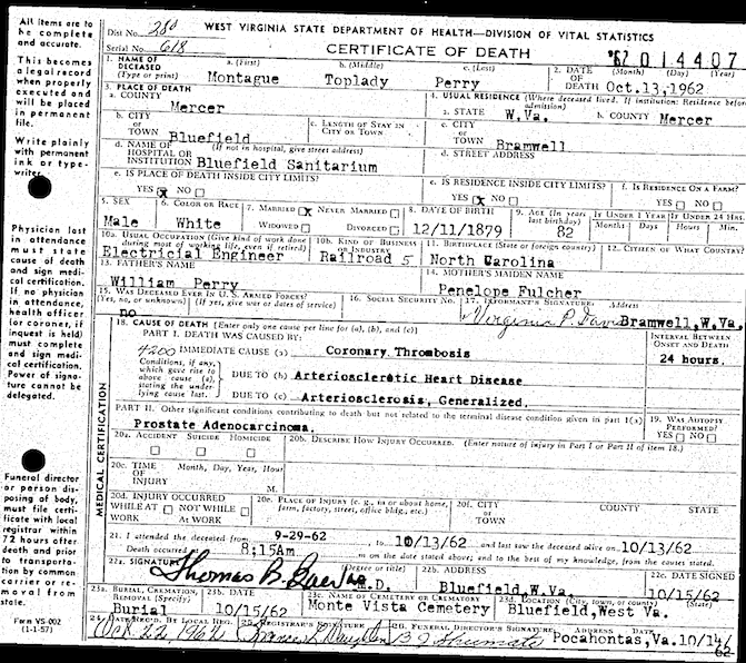 DEATH: 13 Oct 1962 (aged 82), Bramwell, Mercer County, West Virginia