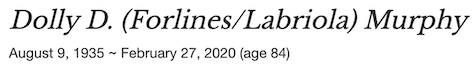 Dolly Labriola Murphy, 84, passed away on February 27, 2020. She was born in Freeman, WV on August 9, 1935 to the late Joseph and Verna Forlines. Dolly will be remembered for having a kind heart, a sweet smile and for all the delicious meals she prepared. No one ever left her home hungry. Dolly was preceded in death by her husband, Jerry Murphy.