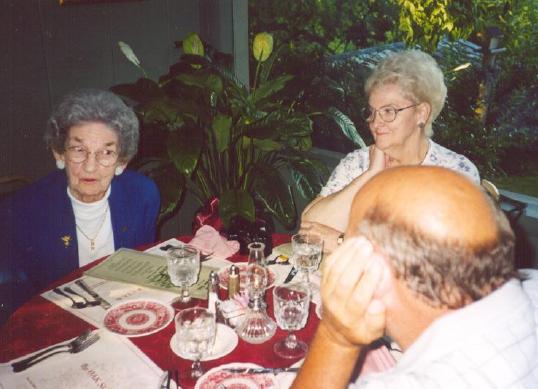 The Forlines sisters, Edna and Barbara enjoy their conversation with John Vaughan at the "Oaks Supper Club" dinner at Pipestem on 27 June 01. ( Photos furnished by : Bill Gross ) |