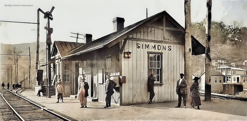 This rural community of Freeman, West Virginia is located along the banks of the Bluestone River and is approximately two miles from the Town Bramwell, WV. Freeman has a heritage that was dominated by "coal" mining operations in the late 1800s. The Buckeye Coal and Coke Company opened operations in 1886 in the small building beside the railway tracks as shown in the picture as taken approximately 1915. Buckeye Coal and Coke operated two tipples at the turn of the century. This company produced over 100,000 tons of coal and 20,000 tons of coke each year from the Buckeye mine; located in Buckeye Hollow just north of Freeman on Route 52. John Davis Hewitt was Vice President and General Manager of the Buckeye Coal and Coke and was one of the Bramwell's true Coal Barons. He was interred in the Freeman Cemetery on October 11, 1903. Many of the buildings in this picture still remain standing. The "Simmons" Depot and Freight Station , shown in the picture foreground, were heavily used with numerous coal trains traveling this line as late as 1955. The very small building visible just to the left of the Simmons Depot and next to the telephone pole was the "Coal House' for the depot. Daily mail was taken across the railroad bridge in a wheel barrow to the town Post Office that was located in the left end of the large building; shown in the center of the picture. Dr. Homer Luttrell's office was located brhind the Caswell Creek Coal Company store that is shown on the Bramwell side of Simmons Creek. In fact, there are three company stores visible in this picture. They are Caswell Creek, Booth Bowen and Buckeye Coal and Coke Company; along with a meat market, post office and "Crows Roost" (the hand rail along the sidewalk from the post office to the meat market; so named because the local men sat on the hand rail and loafed ). While the the Simmons Depot and Freight Station are shown at the near side of the railroad bridge in the picture, Oscar "Beef" Bennett, chief of police, had his office in the west end of the "Coon" Freight Station on the Freeman side, (north) of the Bluestone River. However, the Coon Freight Station building is not visible in the picture. Visible on the Simmons (south) side of the Bluestone River in the picture is the Lyman Tibb's home and the railroad section crew's tool shed. The Buckeye Company houses on the right side of the Buckeye Coal & Coke Company Store were known as Buckeye Row. Notice that in the picture Route 52 had not been built at the turn of the century. The road that is visible to the left of the picture center continued a short distance and than forked, with the right fork leading to Sinai Mountain, while the left fork went north up Simmons Creek to the Buckeye Coal Mines and then on into McDowell County. Few people know that Simmons is on the south side of Bluestone River while Freeman is on the north side of this river. Another Fact: The historic Freeman "Oak Hill Cemetery" is located on the east end of the hill in the picture background. John Davis Hewitt and John Freeman along with their wives are buried in this cemetary. ( Our sincere thanks to Bill Myers for his memories, his help in identifying buildings in this picture and furnishing additional historic facts on Freeman and Simmons. ) This is an enlargement of the Simmons Depot that is shown in the foreground of the top picture. Note that the HISTORIC BOOTH-BOWEN COAL COMPANY STORE can also be seen in the right of this picture.