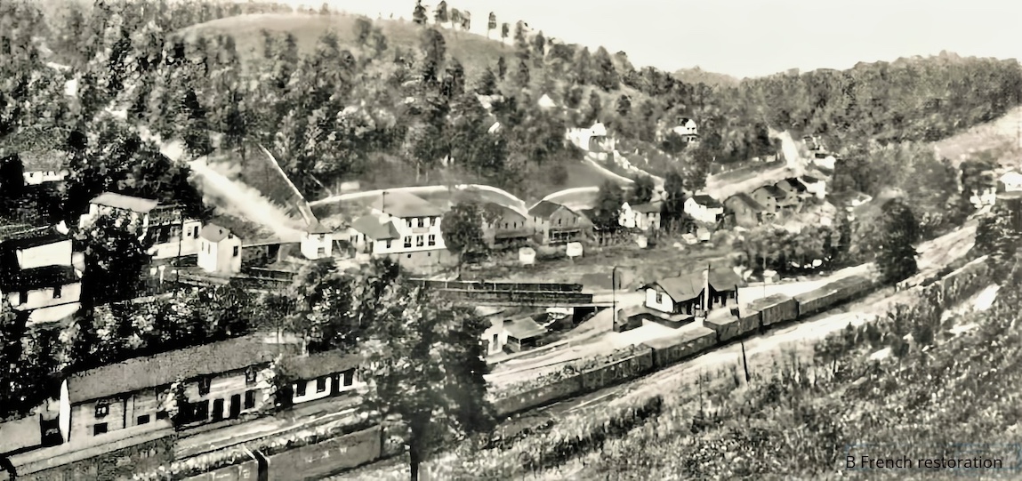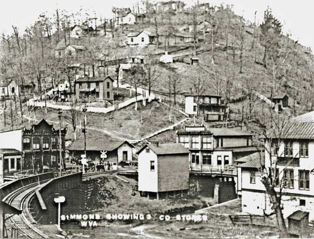 Above is a view of Freeman is from a 1916 post card. It gives views of all three coal company stores in Freeman in 1916. They included the Buckeye Coal & Coke Company Store (Right), Booth Bowen Coal & Coke Company Store (Center) and the Caswell Creek Coak & Coke Compny Store (Left). The one room butcher shop is in the midddle of the picture. Jones' Hill is in the photogtraph background. Oscar "Beef" Bennett, chief of police, had his office in the west end of the "Coon" Freight Station that visible on the Freeman side, (north) of the Bluestone River. Simmons Creek runs from the North along the right side of the butcher shop building. This creek empties into the Bluestone River at the railroad tressel.