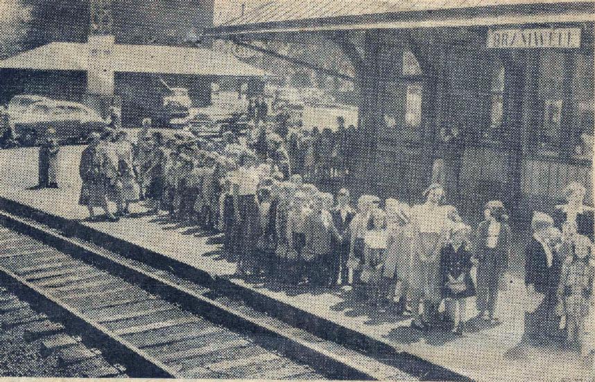 From the Bluefield Daily Telegraph in 1952 some of the 350 Bramwell Grade School students are shown in the top photograph lining up to board the last trip of the Pocahontas, Bramwell and Wenonah train. In the lower photograph Conductor Ed Coleman helps teachers and students onto the train On the far left of the bottom photograph is teacher Miss Eunice Garett. Teachers student aid Shirley Minnick is shown on the right of the phototograph wearing a dark sweater. Charlotte Austin is just to the left of Shirley. (Sunset News Staff Photo). Photographs furnished by: Shirley Minnick Smith, BHS Class '53. |