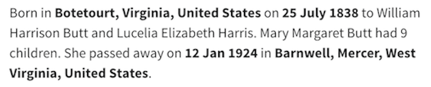 BRAMWELL, WV PIONEER - MARY MARGARET BUTT TABOR