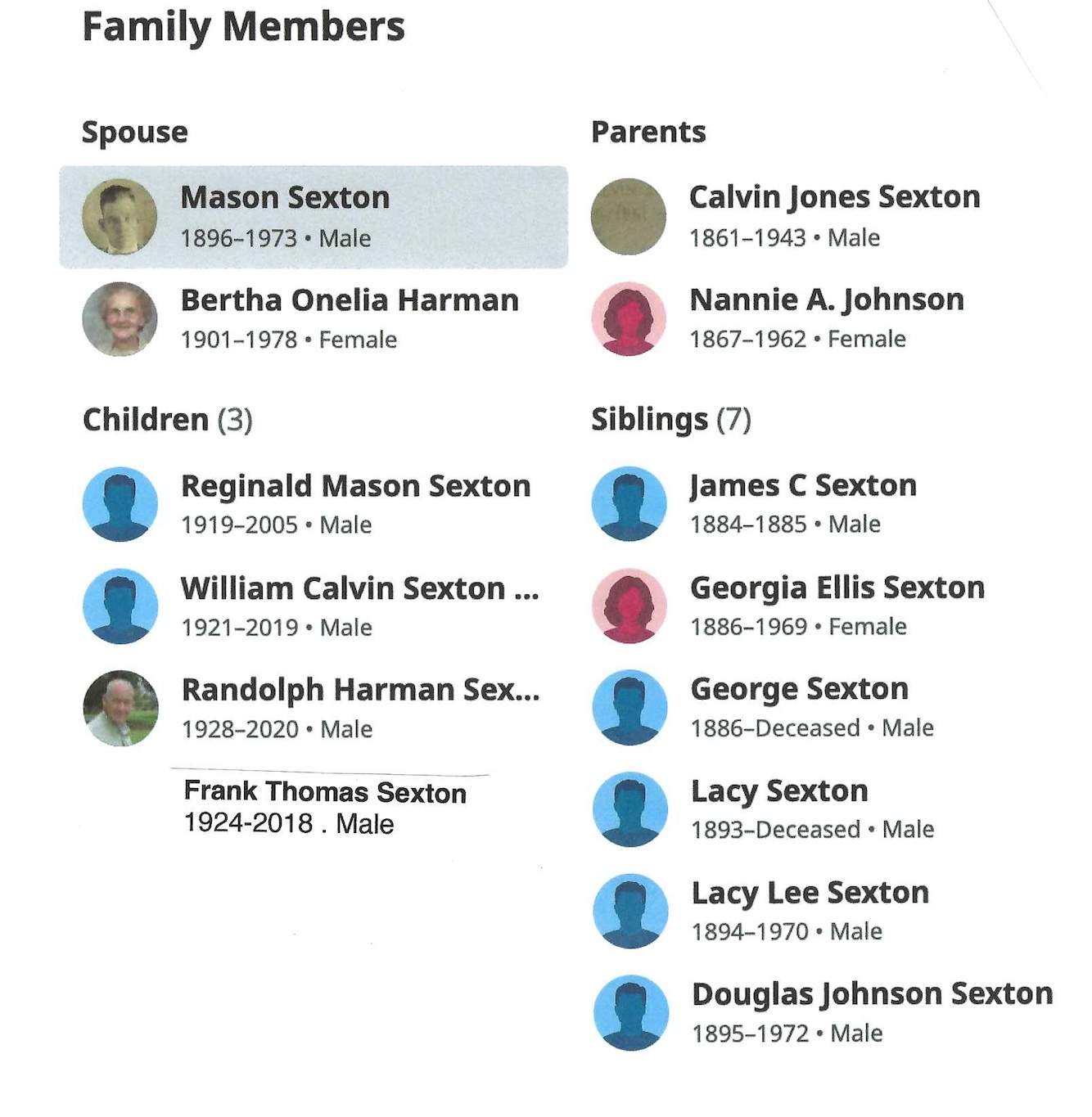 Brief Life History of MasonWhen Mason Sexton was born on 3 September 1896, in Pulaski, Virginia, United States, his father, Calvin Jones Sexton, was 35 and his mother, Nannie A. Johnson, was 29. He had at least 3 sons with Bertha Onelia Harman. He lived in Rock, Mercer, West Virginia, United States in 1910 and Bramwell, Mercer, West Virginia, United States in 1930. He died on 8 March 1973, in Mercer, West Virginia, United States, at the age of 76. Brief Life History of Bertha OneliaWhen Bertha Onelia Harman was born on 5 December 1901, in West Virginia, United States, her father, William Anderson Harman, was 42 and her mother, Martha Ellen Scott, was 38. She had at least 3 sons with Mason Sexton. She lived in Bramwell, Mercer, West Virginia, United States in 1930 and Rock District, Mercer, West Virginia, United States in 1940. She died on 23 February 1978, in Princeton, Mercer, West Virginia, United States, at the age of 76, and was buried in Monte Vista Park Cemetery, Bluefield, Mercer, West Virginia, United States.