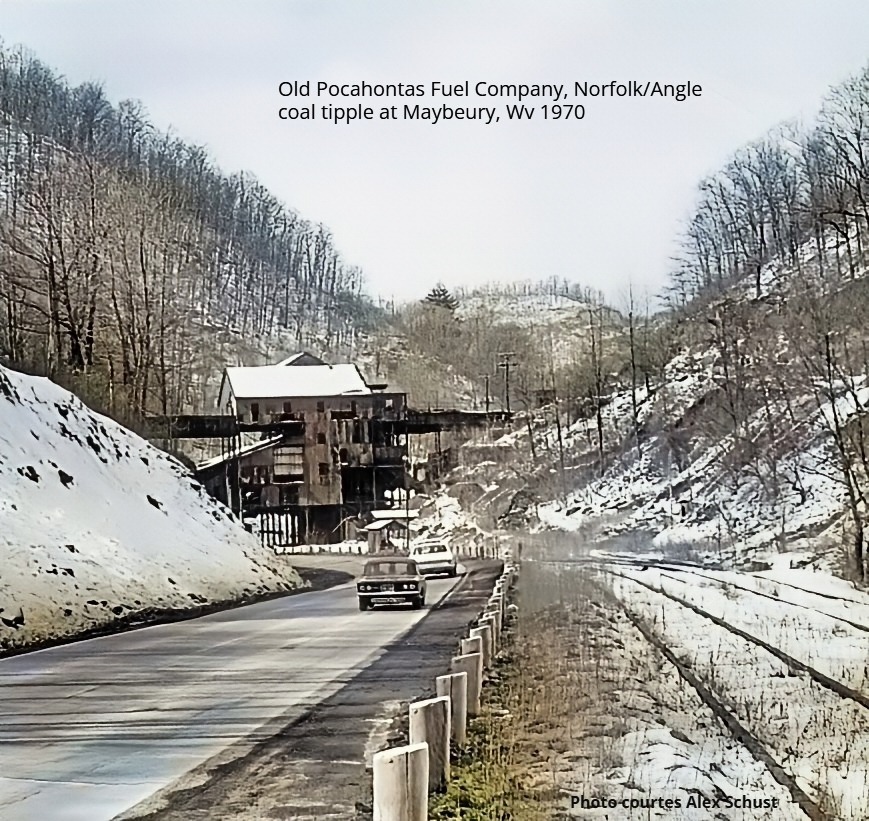 Maybeury's Norfolk and Angle mines were worked out and shut down in 1955 although the tipple continued to process coal from area strip mines until 1958. The Norfolk/Angle coal tipple was then shut down and sat