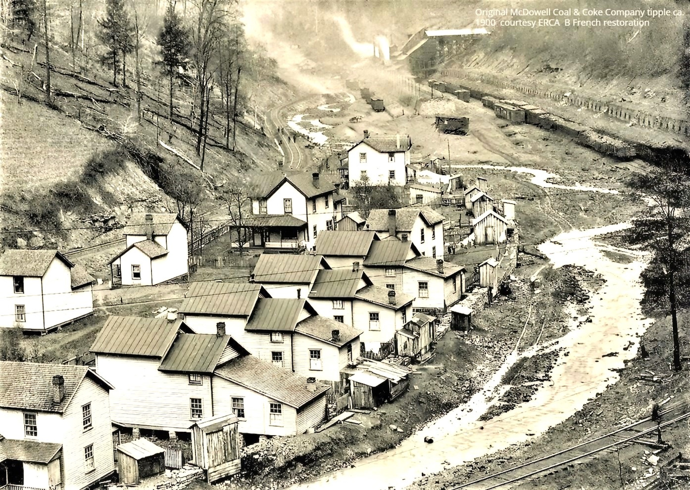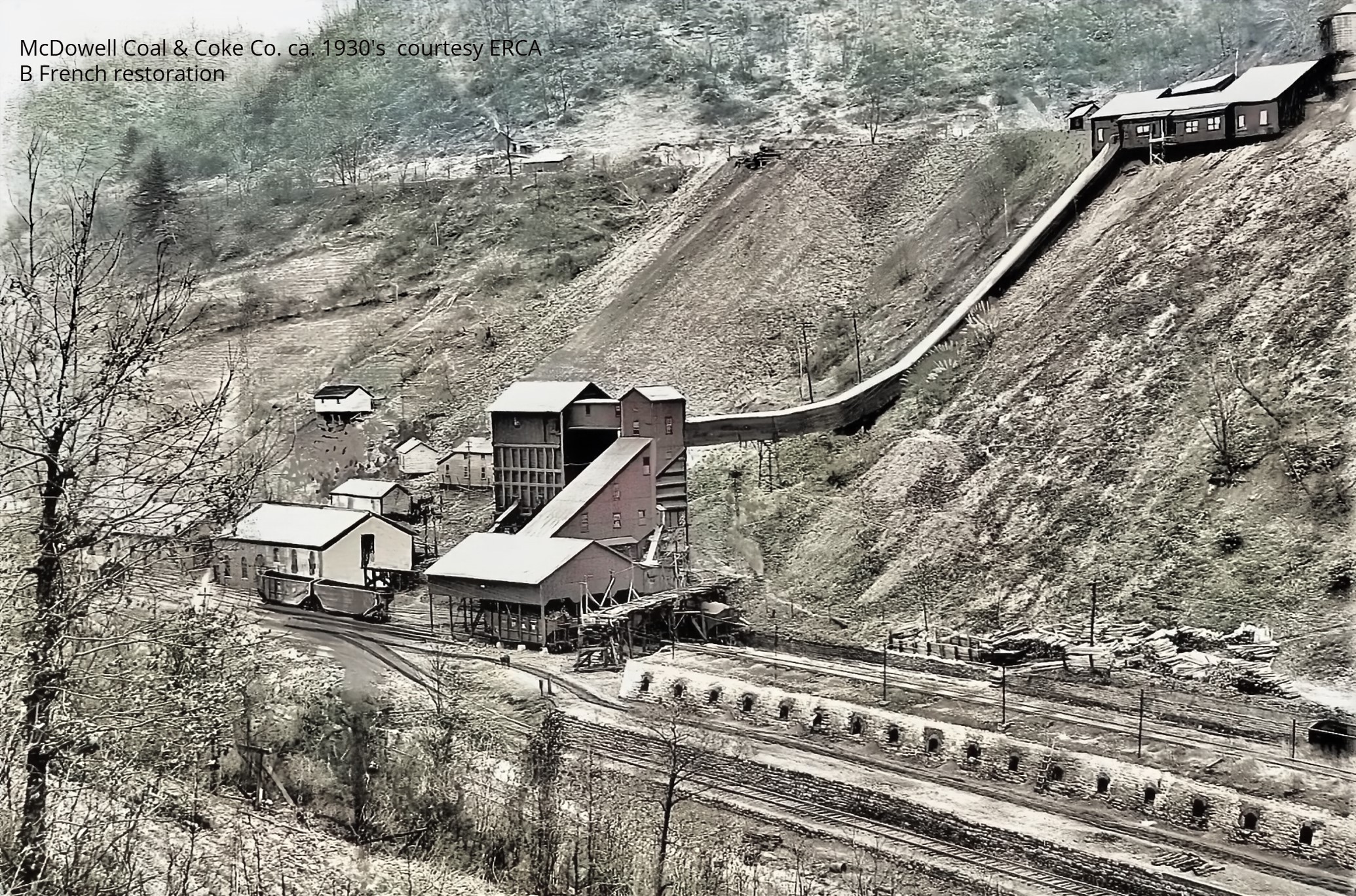 This was the second and more modern tipple shown here at McDowell that replaced the original coal tipple. The McDowell Coal & Coke Company had expanded its coal acreage and opened a second mine that required a fifteen-hundred-foot-long tram road that enabled coal to be dumped through this tipple. When this photo was taken in 1934, the coke ovens had been shut down the mines were working out and preparing to shut down after forty-two years of production.