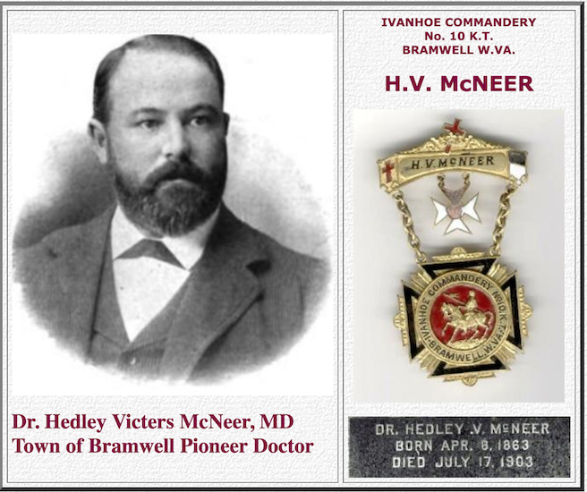 Updated research also verifies that Dr. H. V. McNeer's wife was Nannie M. Gaver McNeer (May 8, 1867 - April 20, 1929). Nannie was born in Rockingham County, Virginia.She is buried in the Green Hills Cemetery, Stephens City, Frederick County, VA under her maiden name, Nannie M. Gaver. They were married on Nov. 17, 1892 in Hedgesville, Berkeley, West Virgnia. Nannie's father, H.A. Garver conducted the marriage ceremony. H.A. Garver's wife was N.H. Gaver. Some of this information is from the Virginia Cemetery Project that features a photograph of Mrs. Nannie Garver McNeer's Tombstone..on the project's internet site.. (This updated text from Joe Miller of Bramwell. Joe lived in the Historic McNeer House.) ** Research indicates that Dr. McNeer's daughter may have been Bessie McNeer O'Neal (Nov.24, 1893 to Mar. 25, 1954) wife of S. D. O'Neal. She is also buried in the Green Hills Cemetery, Stephens City, Frederick County, VA. Dr. H.V. McNeer's Parents: Richard Tucker McNeer (1825 - 1891) - Amanda J. Pence McNeer (1830 - 1879). I(Actual Ivanhoe Commandery Metal and research provided by: William A. Petty) (Grave Site Photograph By: Ken Bowen)