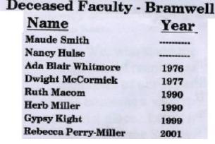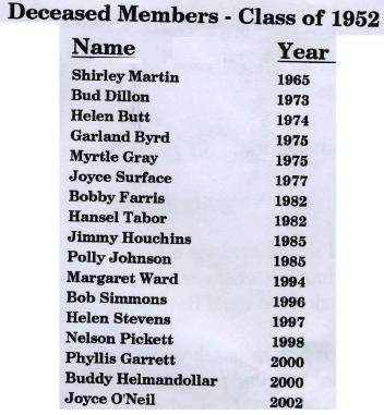 Carl Hurst - Jan., 2016 John Benton Harris - May, 2011 Eddie C. Scott - 2002 Gloria Louise Dawson Stoker - Nov. 19, 1934 - July 26, 2025 Roger "Pot" Adams - Dec. 23, 1933 - Jan. 19, 2021 Lena Ellen Blizzard Riley - Mar. 30, 2021 Benny P. Profitt - 1933 - Oct. 30, 2015 Anne Haynes Hickman - Oct. 10. 1934 - Nov. 20, 2018 Franklin Sargent - Aug. 18, 1934 - March 3, 2022 Polly Johnson Brannon 1934 - 1985 David Cline - 1933 - July 20, 2010 Anita Bell - 1934 - Apr. 29, 2014 William R. "Bill" Payne - Oct. 17, 2008 Mary Jane Sizemore - June 19, 2011 Kenneth Howell - 1933 - June 22, 2010