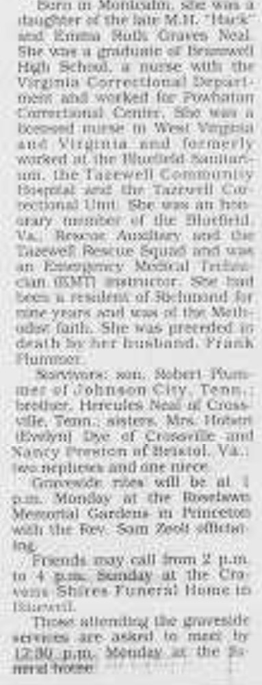 Etta Lee Neal Plummer ( 1936 - 1993 ) Obituary: Feb. 13, 1993 Feb. 13, 1993 - Etta Lee Neal Plummer (57) of Richmond , Va. — Etta Lee was formerly of Tazewell. Va. She died on Thursday, Feb. 11, 1993 at a Richmond hospital. Etta Lee was born in Montcalm, WV. Etta Lee was a board certified nurse in Virginia and West Virginia. She was a nurse with the Virginia Correctional Department and worked at the Powhaton Correctionl Center. She had formerly worked for the Bluefield Sanitorium, Tazwell Community Hospital and Tazwell Correctional Unit. She was a honorary member of the Bluefield, VA Rescue Auxualry and Tazwell Rescue Squad. Eta Lee had been a resident of Richmond for nine years and was of the Methodist faith. She was preceded in death by her husband, Frank Plummer. Funeral services were held at the Cravens/Shires Funeral Home at 2 PM on Sunday, Feb. 14, 1993 in Bluewell, WV. Burial was in the Roselawn Memorial Gardens in Princeton, West Virginia. Etta Lee Neal Plummer obituary in Bluefield Daily Telegraph - Feb. 13, 1993: