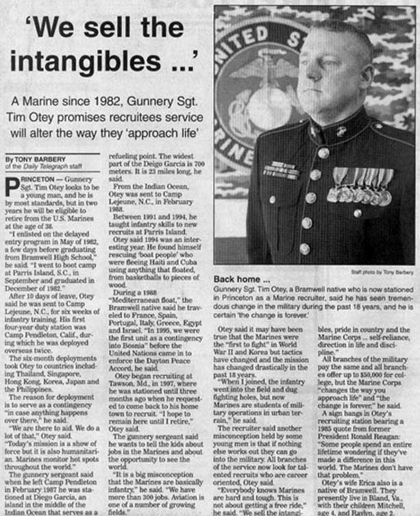 The above article is from the Bluefield Daily Telegraph , dated November 25, 2000. While the article highlights Gunnery Sgt. Tim Otey's career as a marine, it does not point out how honored Bramwell and Bramwell High School alumni are to have a fellow Bramwell resident serving in his position. He has made a significant difference in the world through his distinguished military service as a career U. S. Marine. Tim's wife is the former Erica Waller, BHS Class of 90. The Bramwell commuity is pleased and honored to have Gunnery Sgt. Tim Otey, Erica and their two children back near home; where Tim plans to finish out his final tour of military duty. ( Article from the Bluefield Daily Telegraph and furnished by Erica Waller Otey , BHS Class '90 ) |
