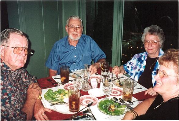 ( L - R ) John Petty '49, Bill Gross, Molly Clark Gross '49 and Retha Wright Petty '51 enjoying dinner at the Oaks Supper Club in Pipestem on 28 June 01, while attending the BHS Class '51 Reunion. ( Photos furnished by : Shirley Jarrett, BHS Class '51 ) |