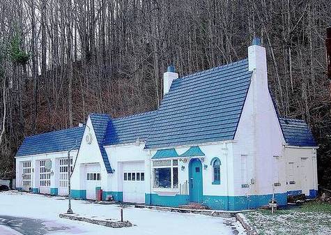 This Pure Oil Service Station was built in 1938. Typical Tudor Revival Style gas station building. It was first opened and operated by Bramwell resident, Leo Powell Haynes in 1939. It is located on Rt. 52 near the bottom of Pinacle Mountain within the present Town of Bramwell city limits. A Esso gas station, operated by the Gibson family was located on a lot next to this service station. Many a Bramwell High School students worked at these two service stations over the 40-50 years that they were open. The Pure Oil Station building is a brick structure with a ceramic tile roof and and remains in good condition. It has stood empty for many years while the Esso Service Station building has been gone for over 30 years. In the early 1950s a days work at these service stations earned a part time worker $3.00. One of the first television sets in the area was to be found in the this Pure Oil gas station in 1952. The television signal came from a huge antenna located on top of the mountain behind the station. The line feeding the signal was the expensive 300 ohm twin lead. The poor "snowy" picture was enhanced by placing multi-color celephene sheets over the TV screen."Did not help much".