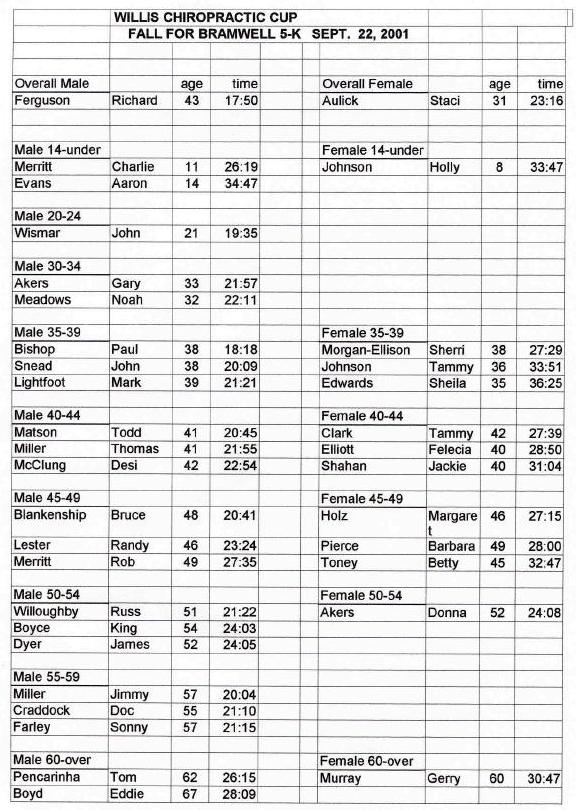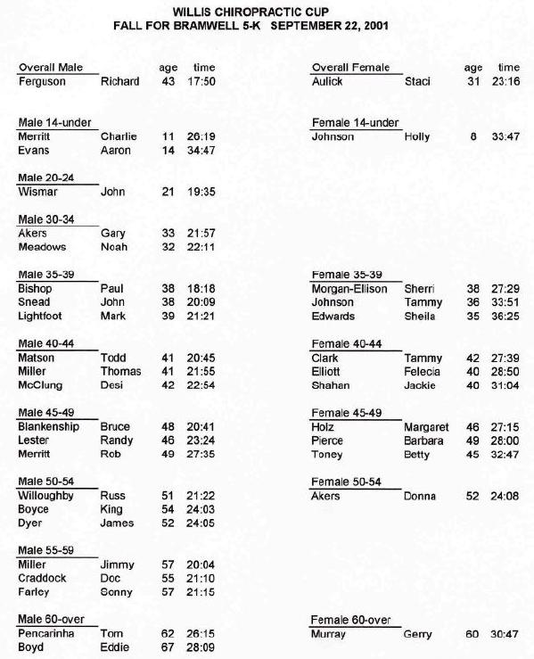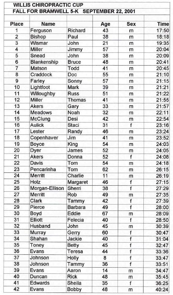 REPORTED BY: Bill and Don Pierce Race Results for "Fall For Bramwell 5K": Bramwell, West Virginia On Saturday, September 22nd, the historic town of Bramwell celebrated the beginning of autumn with a road race whose course paralleled the Bluestone River. With perfect weather conditions and the citizens of Bramwell lining Main Street as spectators, forty-two runners competed. The recently reconstructed Train Depot provided an attractive backdrop for the start and finish of the race. Dr. Richard Ferguson, Running Journal columnist and professor from Danville, Virginia, was the overall race winner in 17:50. The first female finisher was Stacy Aulick of Huntington, West Virginia. John Wismar of Cologne, Germany, was third overall and won the 20-24 male age-group and traveled the farthest to participate. Below are the overall results and age-group award winners.