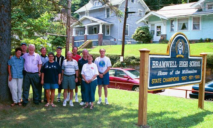 Bramwell High School Class '62 alumni celebrating their 40th class reunion on the front lawn of BHS in June 2002. Front row ( L - R ): Ruth Sharon Belcher Moorehead, Wilson Tabor, Joyce Ann Little Sparks, Larry Grainger, Mary Lewise Staton Carter. Back row (