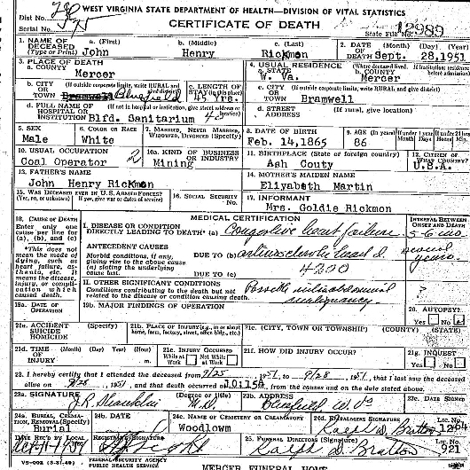 John Henry Rickmon was the Tipple Boss at the Buckeye Coal & Coke Co. mine No. 2 in Buckeye Hollow, near Freeman, WV. His small office building was located across the RR tracks beside the Buckeye Tipple No. 2. He was employed by Buckeye Coal & Coke Company for many years. Mr Rickmond was well known and long time resident of Bramwell, WV and he was very well respected throughout the community. John Henry Rickmon was born on month day 1865 in, North Carolina, to John Henry Rickmon, Sr. and Elizabeth Rickmon. John married Laura Bell Mitchell in 1889, at age 24 in Virginia. They had 2 daughters: Gladys Verneon Rickmon Eastwood and Goldie Frances Rickmon. John Rickmon passed away in 1951, at age 86 in Bramwell, WV. He is buried in Woodlawn Cemetery Bluewell, Mercer County, West Virginia John Henry Rickmon's daughter, Goldie Frances Rickmon was born on June 23, 1898. She died on November 28, 1994 at 96 years of age. We know that Goldie Rickmon had been residing in Bramwell, Mercer County, West Virginia her entire life. She was extremely knowledgable of the town's history. In her later years she lived in the building that was once the Historic Pence Hotel. |