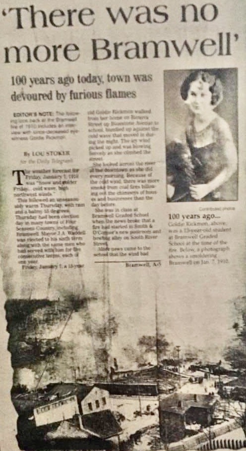 Goldie Frances Rickmon was born on June 23, 1898. She died on November 28, 1994 at 96 years of age. We know that Goldie Rickmon had been residing in Bramwell, Mercer County, West Virginia her entire life. She was extremely knowledgable of the town's history. In her later years she lived in the building that was once the Historic Pence Hotel. Goldie Rickmon's own words on the Historic Bramwell fire in 1910: Goldie remembered, “The big boys were sent from the school to help fight the fire. We girls could only stand at the windows and watch the black smoke as it rose from the town. I was worried about my mother and little sister, Gladys, but was not allowed to leave the safety of school.” The firefighters’ labors were daunting. “You know, it was cold. So cold. They said the water froze to ice as it was sprayed on the burning buildings,” continued Goldie. As the fire raged, it turned the capitol of the coalfield to ashes. Only foundations were left of the 21 buildings that burned. Loss was estimated at $200,000 by Mayor Waddell. “Practically every business in town of Bramwell devoured by furious flames, “ was the January 8 Bluefield Daily Telegraph headline. Special sightseeing trains were dispatched from the Bluefield station on Saturday and Sunday. Many people rode north “to see devastation of the unique town.”