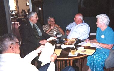 ( L - R ): Coach Buck Thompson, Arnold Nowlin, Ray Helmandoller, John Vaughan and Pat Shelton enjoying each other's conversation at Pipestem Resort - June 28, 2001.