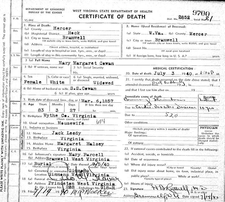 Samuel Wesley Cowan was born in Aug 16, 1855 in Cove, Wythe County Virginia. He moved to Bramwell in the early 1900's. He was married to Margaret Leedy Cowan (1859-1941). They had 9 children. Samuel worked as a farmer and also a merchant in a general store. He died in Bramwell in Dec. 2, 1921 and is resting in The Oak Hill Cemetery, Freeman, WV.