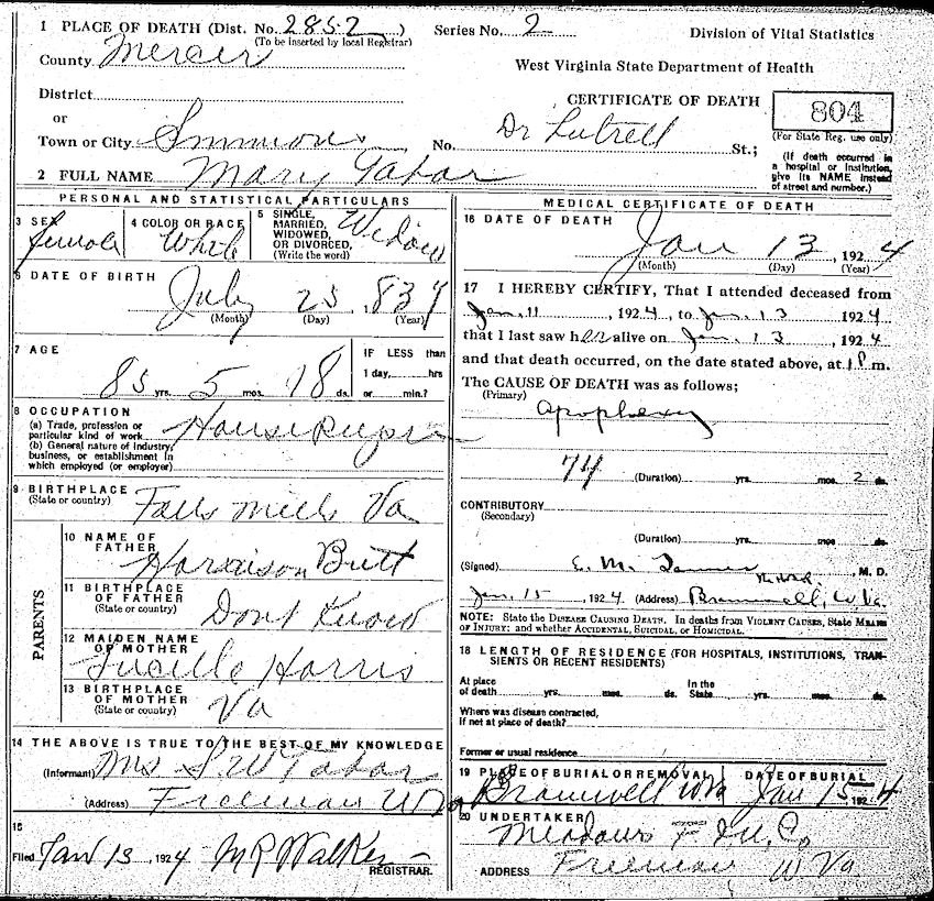 Below is Mary Margaret Butt Tabor Death Certificate: