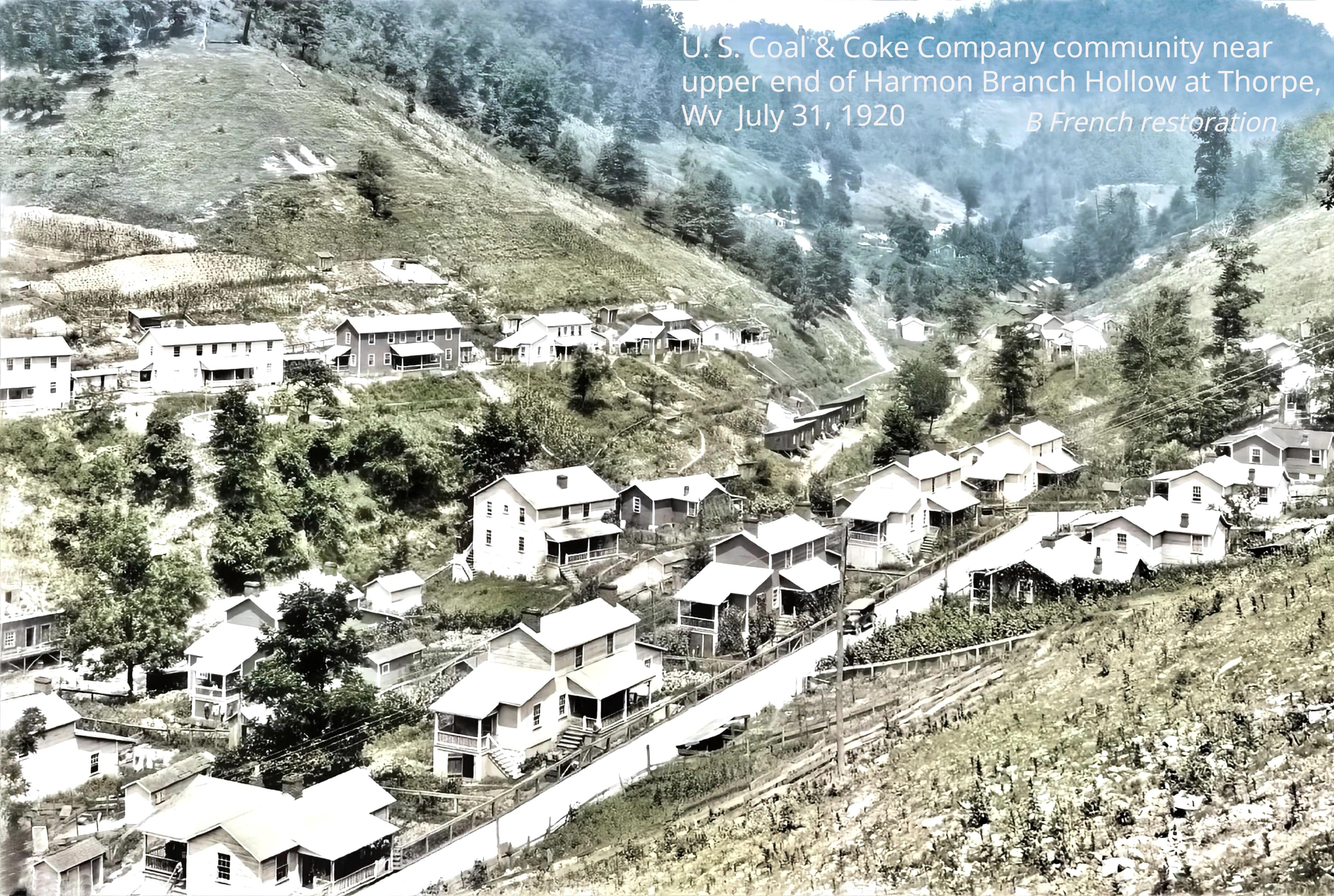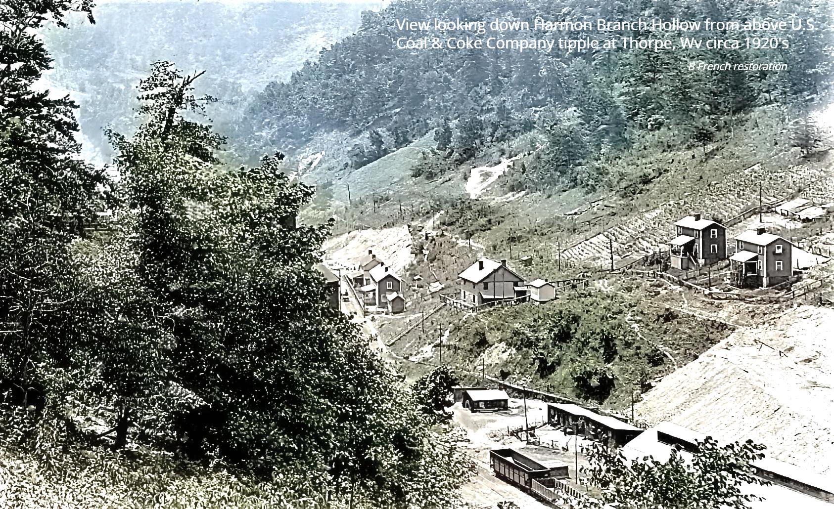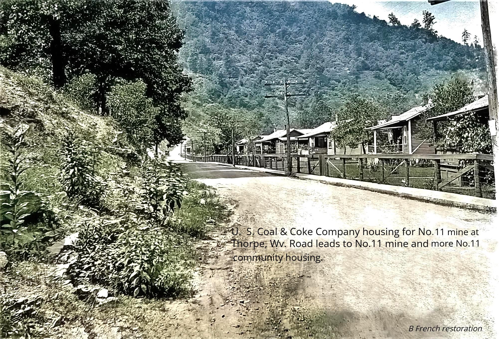 In 1902, the opening of multiple U. S. Coal & Coke Company mines and the construction of their supporting communities was well underway in McDowell County West Virginia. By 1904, the coal company had opened its No.4 mine, which was one of the twelve coal mining operations that would soon make up what was to become known as Gary Hollow. As with all of these mining operations, construction of a supporting community with homes for coal miners and their families near the No.4 mining complex was rapidly being developed. This coal camp community was originally given the name Jared but was changed to Thorpe when the post office opened there in 1906. Thorpe soon became a small "community town" with a large company store where your author once worked, a restaurant, five churches, a white and negro grade school, a Clubhouse (miners boarding house) and a Community Center that contained a barber shop, pool hall and a movie theatre. Many thanks to Alex Schust who published his book "Gary Hollow", where this and much more information on Thorpe can be found.