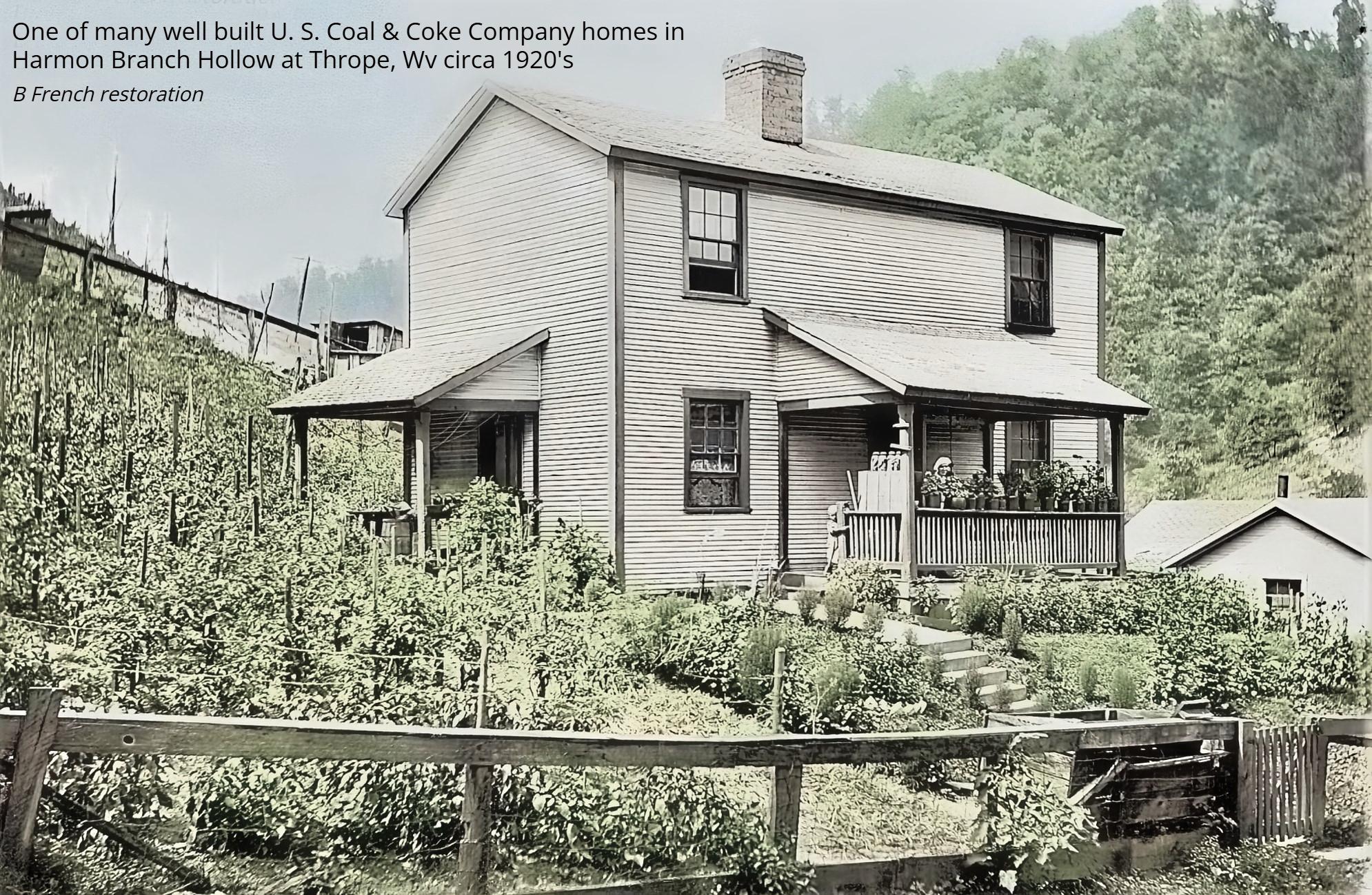 The U. S. Coal & Coke Company, a subsidiary company of United Stated Steel Corporation, opened its Gary No.4 mining operation in Harmon Branch Hollow in McDowell County West Virginia in 1904. The center of its supporting community was located at the mouth of the hollow and was soon named Thrope. The No.4 mine was originally allotted 1,221 acres of coal in the Pocahontas No.3 coal seam that measured six feet four inches in thickness. The mining complex was built primarily for mining and coking coal in the 209 coke ovens that were constructed near the coal tipple. In 1921, the coal coking process at No.4 ceased operations and the coal was shipped directly to the steel mills where the coal coking process had begun taking place. In 1940, the No.4 mine was shut down and the coal tipple torn down. The coal company's reason for closing the mine was at least partly due to what was referred to as a "middleman" embedded in the coal seam that was approximately one foot thick. A "middleman" is a layer of rock or slate in the coal seam that's called "bone", and having to remove it in the coal tipple added additional cost to mining the coal.