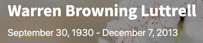 WARREN BROWNING LUTTRELL Of Annandale, VA, died on Saturday, December 7, 2013, at the age of 83. Warren was born in Bramwell, WV, the son of Dr. Homer B. and Virginia P. Luttrell. As a young boy he attended Bramwell School until his family returned moved to the family farm in Amissville, VA at the end of 1943 or early in 1944. After one year living in Amissville his family moved to Pulaski, VA where Warren grew up. He served in the United States Navy during the Korean War, was a graduate of Virginia Polytechnic Institute and had a long and successful career with Merck & Company, Inc. He was an accomplished amateur golfer, a classic film enthusiast and an entertaining raconteur. Warren was a devoted husband, father and grandfather. He is survived by his wife of 59 years, Glenna; his daughter Karen Luttrell Sharpless (Kenneth) of Auburn, AL; his son Richard B. Luttrell (Cynthia) of Bristow, VA; three grandsons, Jordan Luttrell, Carson Luttrell and K. Painter Sharpless and one stepgrandson, Michael A. Sharpless. He is also survived by his brother Richard W. Luttrell (Carol) and four nieces. Friends may visit from 1 to 2 p.m. with a memorial service starting at 2 p.m. on Tuesday, December 17 at Fairfax Memorial Funeral Home, 9902 Braddock Rd., Fairfax, VA 22032. In lieu of flowers, donations may be made to Johns Hopkins/Patrick C. Walsh Prostate Cancer Research Fund.